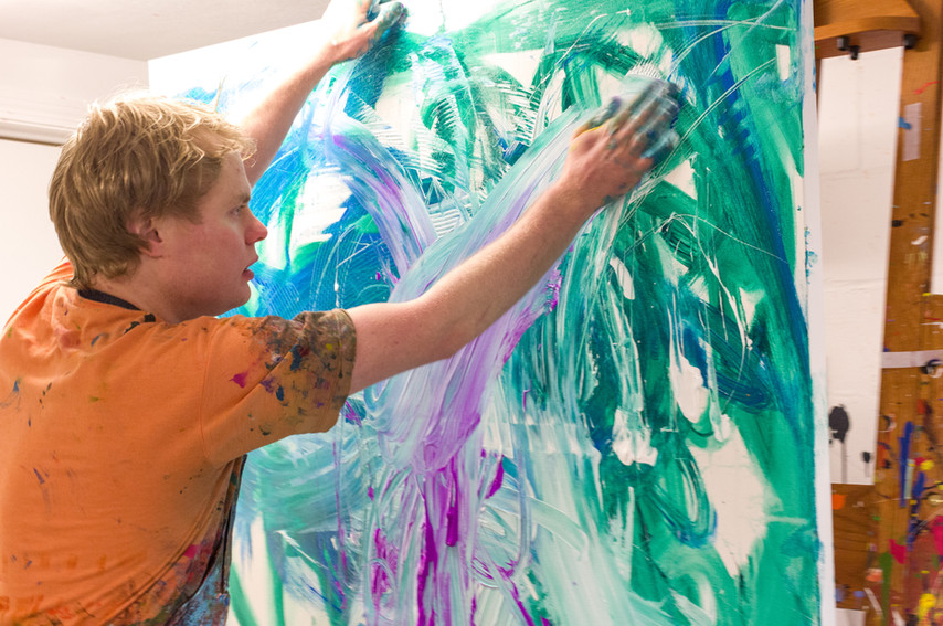 The model was developed, as always, with Eve’s son Billy as the first student. The process was gradual. During Billy’s preschool and elementary years, art was completely adult-driven and limited to a single rote function, like gluing or coloring with one crayon. Then, over the years, Eve incorporated the Voice Colors methodology to teach Billy different techniques, movement patterns, and mediums like painting.